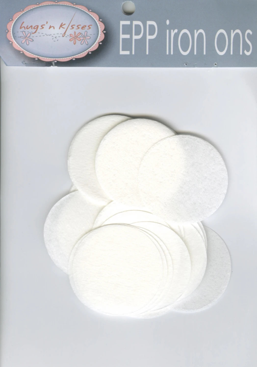 Precision die cut EPP Iron-ons- iron on, leave in English paper piecing paper templates. Packaged in printed quality resealable hangsell bags with instructions & barcode label/name. More information and tutorials can be found at https://www.hugsnkisses.wequilt.com.au/step_by_step_tutorials Each bag contains 100 x 1 1/2" Circles